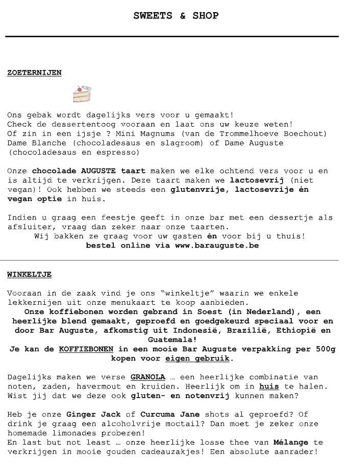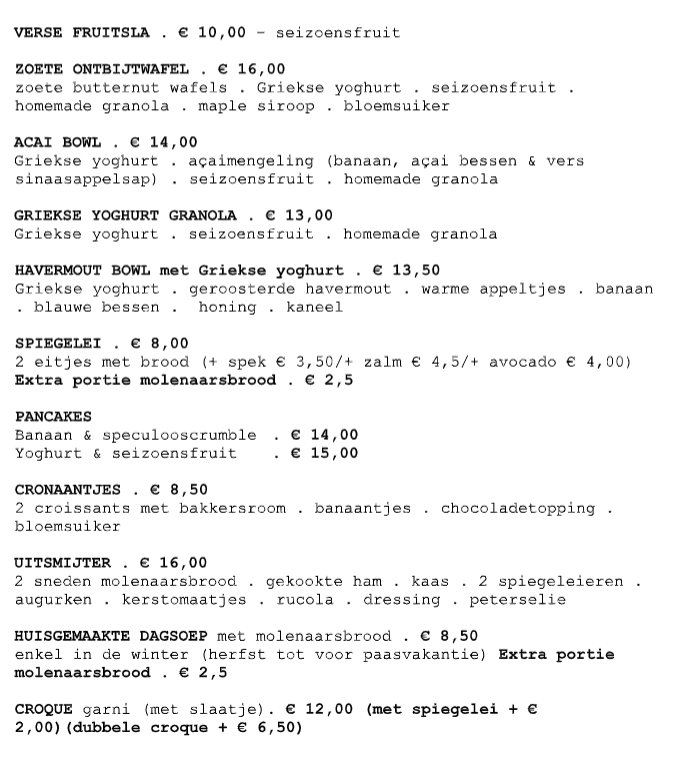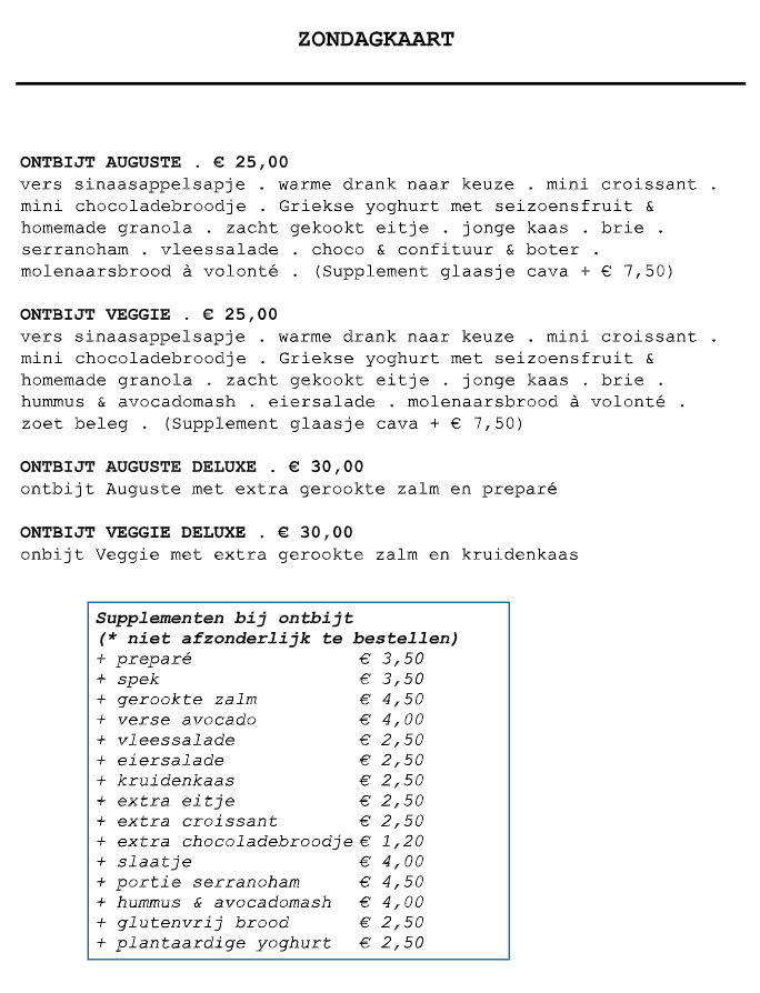 Sunday Brunchday! Op zondag zetten we de perfecte brunchsfeer neer en serveren we uitsluitend de heerlijkste gerechten van onze speciale zondagskaart. Geniet van een uitgebreid aanbod aan smaakvolle en verse bereidingen, ideaal om het weekend in stijl af te sluiten. Vergeet niet dat onze keuken dagelijks om 14u sluit, dus kom op tijd en laat je verwennen met een heerlijke brunchervaring!
